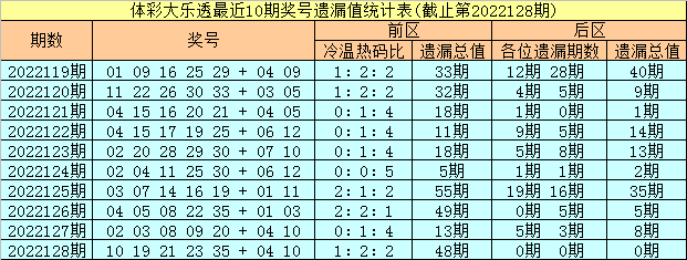 上期回顾:体彩大乐透第2022128期奖号为:10 19 21 23 35 + 04 10,前区奖号冷温热码比为1:2:2,遗漏总值为48期,后区奖号遗漏总值为0期。