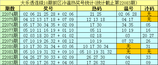 大乐透第22074期-第22083期前区奖号冷温热分布统计:
