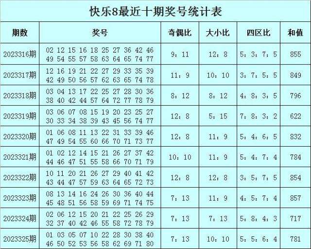 福彩快乐8第2023325期开奖回顾:01 03 05 07 10 22 28 30 38 40 46 50 52 53 56 58 62 69 71 80,其中奖号四区比为5:5:6:4,奇偶比比为7:13,大小比为10:10,和值为781。