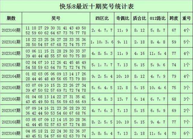 福彩快乐8第2023169期开奖回顾:04 05 18 21 22 24 30 32 36 37 40 45 51 54 57 60 62 63 70 74,其中奖号四区比为3:8:5:4,奇偶比为7:13,质合比为2:18,跨度为70,012路比为11:5:4,开出6个重号:05、36、45、57、63、74。