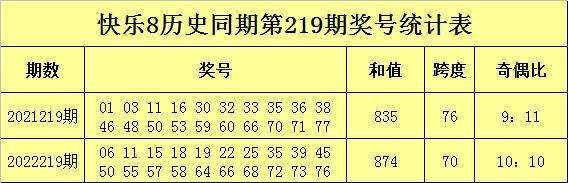 和值分析:历史同期第219期奖号和值出现范围在835-874之间,波动了39个点位,和值均值为854。5,去年同期和值开出874,上升了39个点位,对比去年同期和值,今年第219期和值预计继续上升,看好出现在50附近。