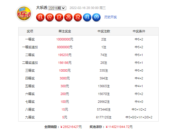 大乐透22016期开奖。当期开奖号码为:前区01 07 17 26 32,后区01 09。当期前区号码大小比为2:3,奇偶比为3:2,三区比2:1:2,前区开出1枚重号01 ;后区开出小大组合01 09。