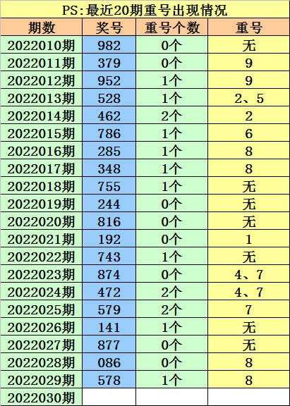 最近100期开奖中,含有重号的奖号有60期,最近20期含有重号的奖号有13期,最近10期含有重号的奖号有6期。本期注意重号落号。