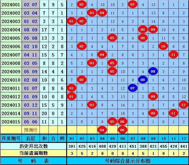 后区分析:后区上期开出2路+0路奖号05和06,最近20期后区0路奖号开出13个,1路奖号出现10个,2路奖号出现17个,最近8期后区0路奖号出现7个,1路奖号出现3个,2路奖号出现6个,本期后区注意号码:02、03、04、06、12,单挑两码组合04+06。