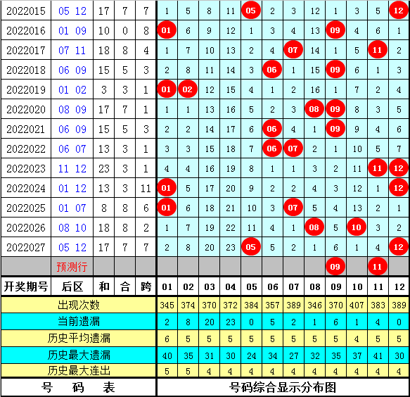 前区奇偶比3:2,前区大小比2:3,前区012路比2:1:2,前区和值为83,前区极距为29,与上期有1个同号:11。