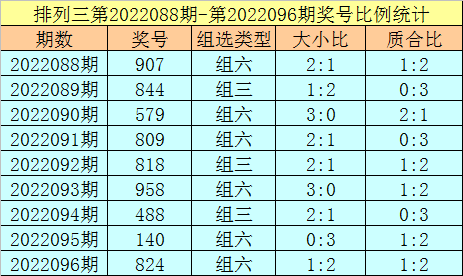 上期回顾:排列三第2022097期奖号为096。奖号形态为组六,012路比为3:0:0,和值为15,奇偶比为1:2,大小比为2:1,跨度为9。