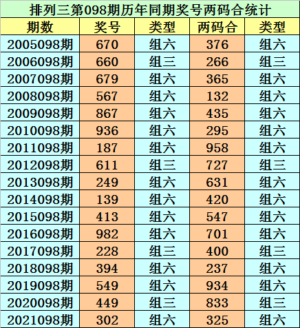 在历年同期中两码合开出年限分别为:3出现9年,2出现7年,5出现6年,4、7出现5年,6出现4年,0、1、9出现3年,8出现2年,第2022098期预计两码合出现:1、2、9。