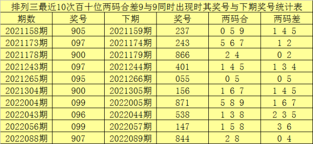 在历年开奖中,两码差开出年限分别为:1出现10年,6出现8年,2出现7年,5出现5年,0、3、7出现4年,4、8出现1年,9出现0年,第2022098期预计两码差出现:1、2、3。