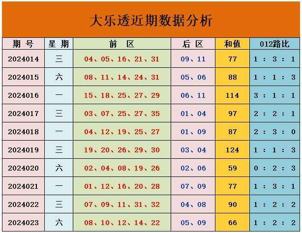 上期回顾:大乐透第2024023期奖号:前区08、10、12、14、22,后区05、09,前区奖号和值为66,三区比为3:2:0,后区开出小大组合05、09