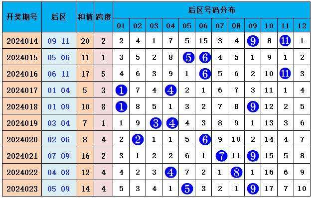 和值分析:上期后区和值为14,比前期上升2个点位,预测本期和值走势变化上升,推荐和值区间16--20
