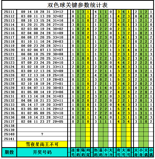 以下是作者手工统计的双色球关键参数统计表,对喜欢参数分析、过滤缩水、选号胆杀的技术性双色球爱好者有所帮助,其它读者可略过不看。