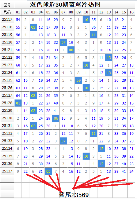 蓝球本期有热蓝8枚,冷蓝8枚,蓝球冷码数量一样。上期开出冷蓝,由于近期蓝球冷热交替开出规律不明显,本期蓝球冷热难定。