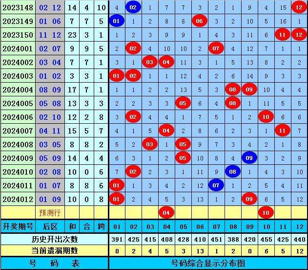 后区分析【一区01-04,二区05-08,三区09-12】:上期后区奖号为01和09,分别落在第一、三区,近50期后区三区比为37:31:32,近10期三区比为8:7:5,本期注意第一、三区号码出现,关注两码04+10。