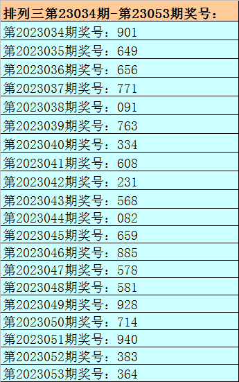 1。排列三最近十期分别开出号码:082-659-885-578-581-928-714-940-383-364,其中有7期奖号开出了上期的重复号码,本期预计第2023053期奖号:364中有重号,参考号码:3。