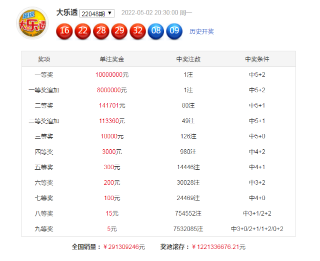 一二等奖中奖纪录: