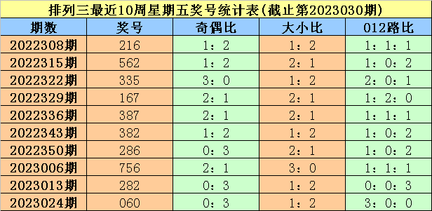 上期回顾:排列三第2023030期奖号为754。其中奖号奇偶比为2:1,大小比为2:1,012路比为0:2:1。