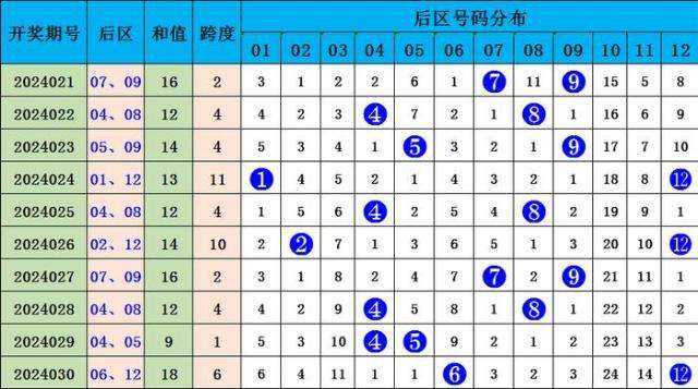 上期前区和值为77,近10期开出的前区奖号和值平均值为82,本期关注和值较上期走势下降,预计本期前区和值在102-107区间内。