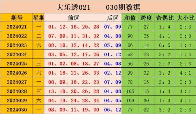 大乐透上期奖号为:前区08、09、11、19、30,后区04、12;龙头08,凤尾30,和值77,跨度22,奇偶比为3:2,大小比为2:3。
