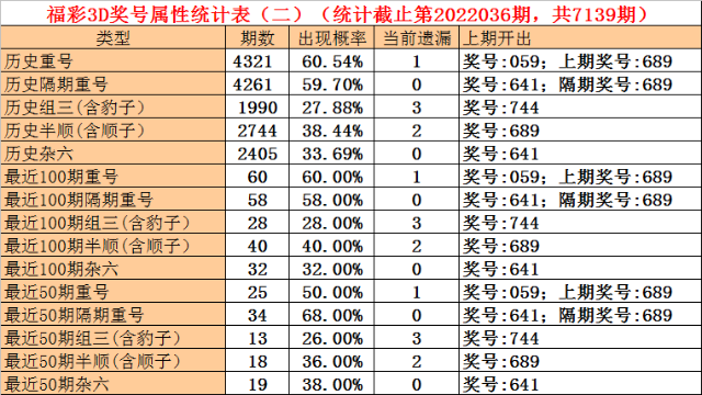 福彩3D第2022034期奖号为689,第2022036期奖号为641,隔期奖号出号6。从统计表中分析,最近100期隔期奖号出现58期,出现比例为58%,最近50期隔期奖号出现34期,出现比例为68%,最近10期隔期奖号出现 6期,出现比例为60%,本期防止试机号中号码轮空。