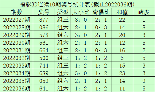 上期奖号:福利彩票3D第2022036期开出奖号641。