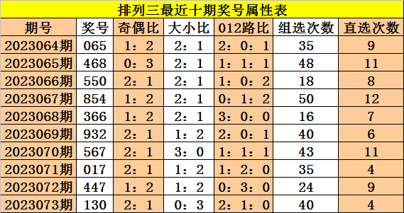 上期回顾:体彩排列三第2023073期奖号:130,奇偶比2:1,大小比0:3,012比2:1:0。