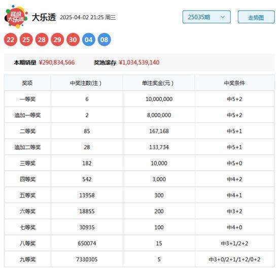 上期开奖:体彩大乐透第2025035期开奖号码为:22 25 28 29 30 + 04 08。