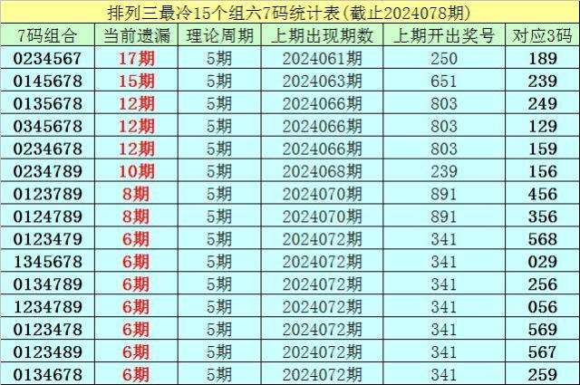 (1)在排列三已开出的6850期奖号中(统计截止第2024078期),目前7码组六遗漏值最大的组合为:0234567,本期遗漏17期;