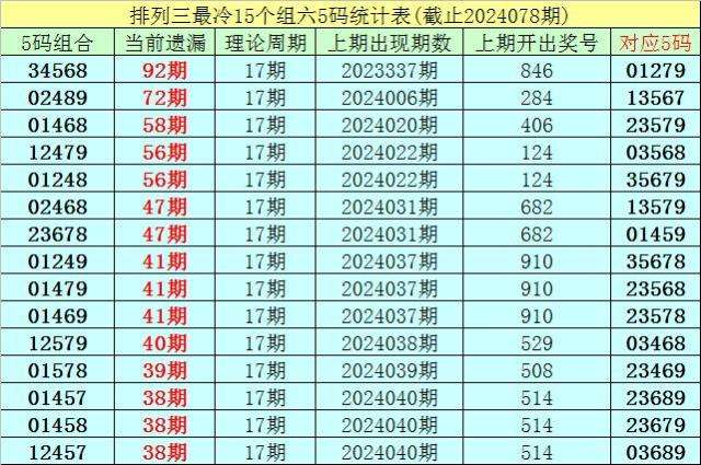 (4)排列三第2024078期遗漏值最大的十个5码组六组合解冻了3个;