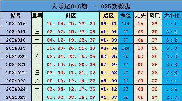 大乐透第2024025期,当期开奖号码为:前区01 02 08 18 27,后区04 08。龙头01,凤尾27,和值56。
