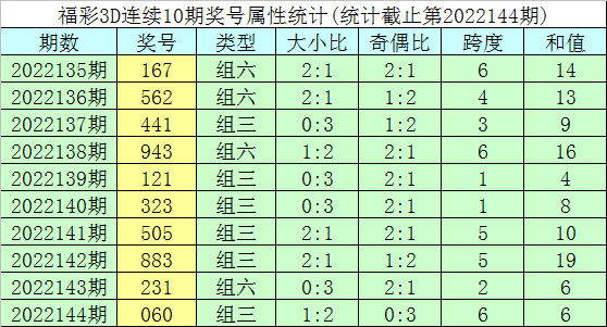 开奖回顾:福彩3D第2022144期奖号为060。奖号形态为组三,大小形态为小大小,奇偶形态为偶偶偶,和值为6,跨度为6。