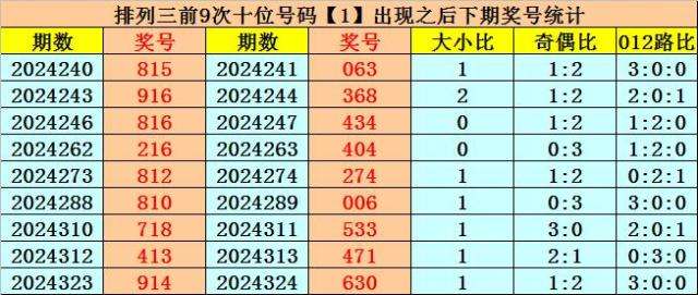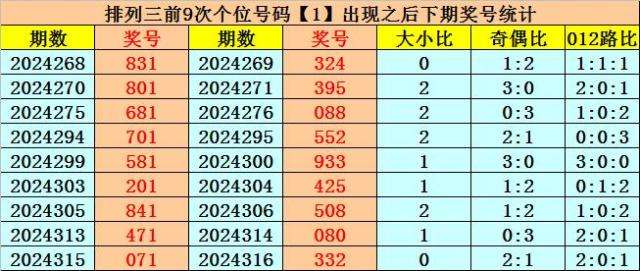 在十位前9次出现号码1后,其下期奖号分别开出:6-6-3-0-7-0-3-7-3,其中奖号个数奇偶比是5:4,大小比是4:5,012路比是7:2:0。