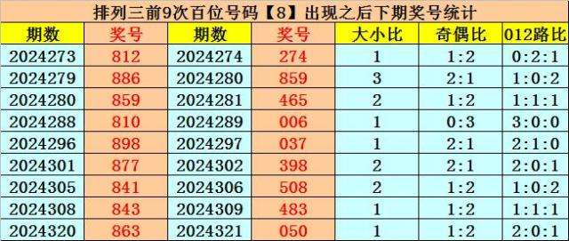 在百位前9次出现号码8之后,下期百位分别开出奖号:2-8-4-0-0-3-5-4-0,其中开出号码个数012路比是4:2:3,奇偶比是2:7,大小比是2:7。