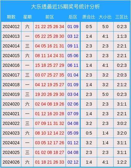 大乐透第2024026期开奖:前区:01、18、21、26、33;后区:02、12。其中大小比为4:1,质合比为1:4,三区比为1:2:2。