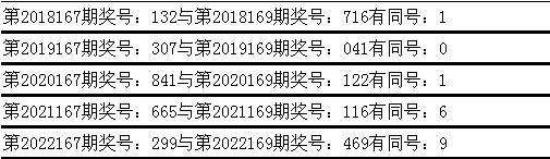 与前期历史同期奖号对比分析,在最近五年开奖中,第167期同期奖号与第169期同期奖号都出现了相同号码: