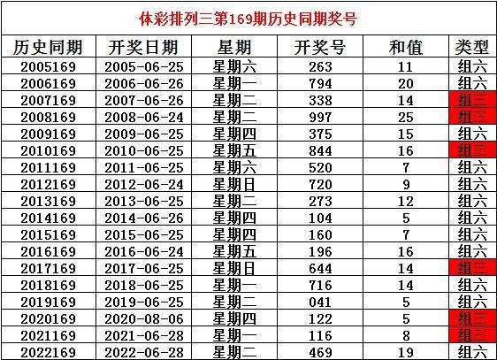 2023年6月28日排列三第169期开奖,历史同期分别开出奖号: