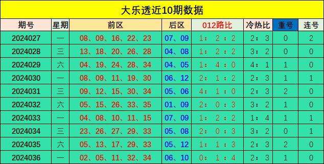 当期前区号码012路比为0:1:4,冷热比为2:3,包含1个重号:05,0组连码组合,后区开出小大组合06 10。
