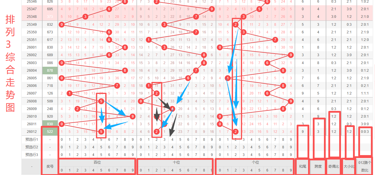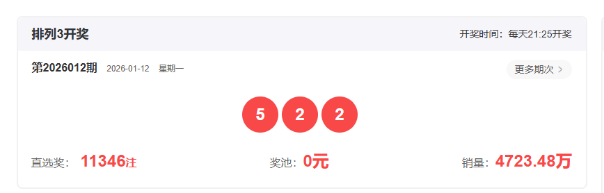 体彩排列32026012开奖号码522,形态为组,奇偶比12,和值9,跨度3,大小比12,【012】路个数比003