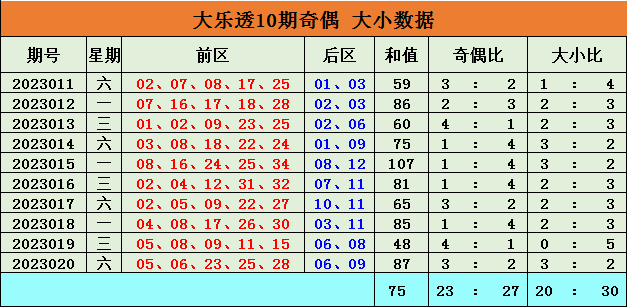 大乐透第23020期开奖。当期开奖号码为:前区05 06 23 25 28,后区06 09。当期前区号码大小比为3:2,奇偶比为3:2,三区比2:1:2,前区开出1组连号05 06;开出1枚重号05;后区开出小大组合06 09。