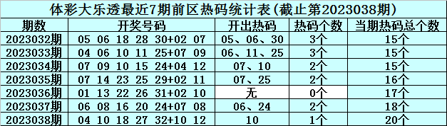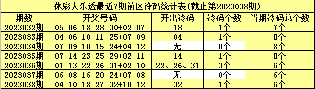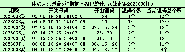 体彩大乐透第2023039期前区冷温热号码分析:(定义:遗漏0-3期号码为热码,遗漏4-9期号码为温码,遗漏9期以上号码为冷码)