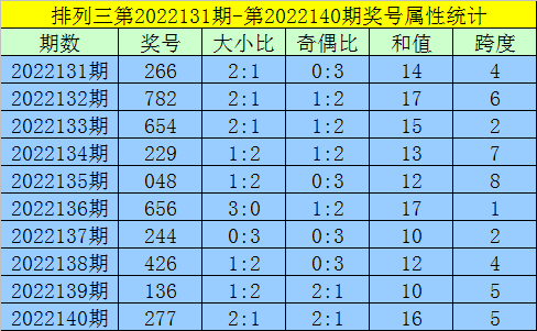上期回顾:排列三第2022140期出现奖号277。开出组三,奇偶比2:1,012路比0:2:1,大小比2:1,和值16,跨度5。
