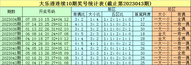 上期回顾:体彩大乐透第2023043期开出奖号:02 04 17 20 27 + 01 08。其中前区奖号奇偶比为2:3,大小比为2:3,五区比为2:0:2:1:0,跨度为25。后区奖号大小比为1:1,奇偶比为1:1。