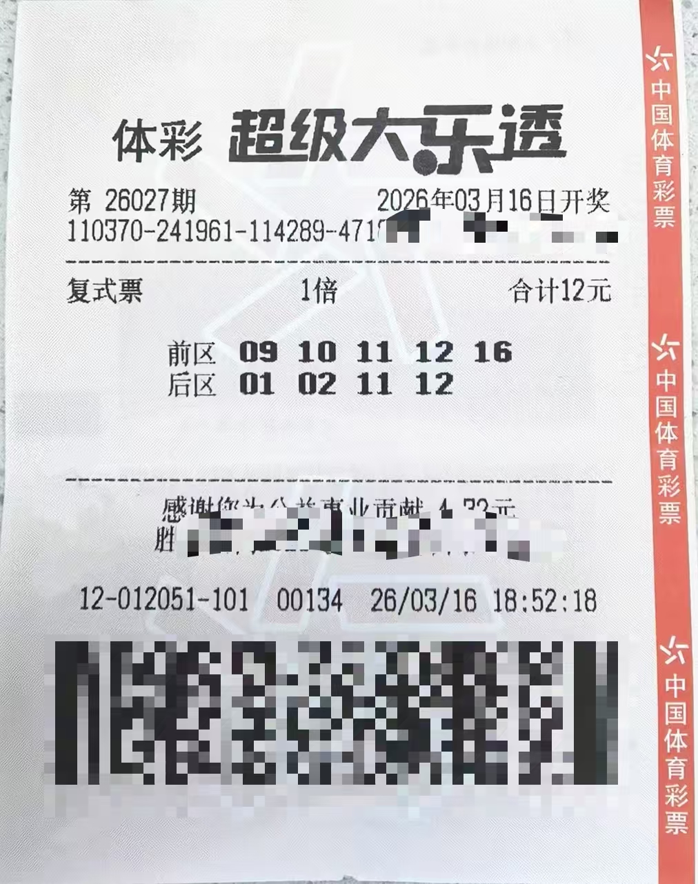 3月16日晚,超级大乐透第26027期开奖,一组特别的"5+4"小复式票为潍坊一对夫妻带来了733万元的幸运大奖。这张仅花费12元的彩票,精准命中当期"09、10、11、12、16+01、11"的开奖号码,成为全国7注一等奖中的一员。