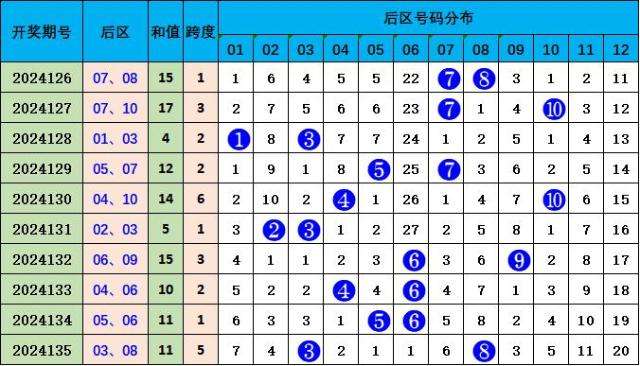 后区分析:上期后区开出03 08,和值11,较上期和值没有点位变化,本期预计和值会下降,看好号码02 04,和值6。