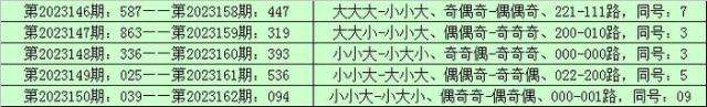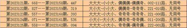 所以,排列三第2023126期奖号:984,与排列三第2023163期奖号可能没有同号。且排列三第2023163期奖号大小比、奇偶比和012路比不会与第2023126期奖号直选形态:大大小、奇偶偶和021路全部相同。