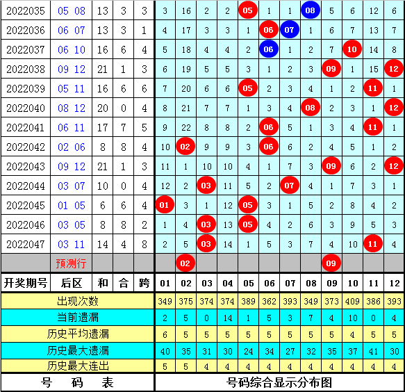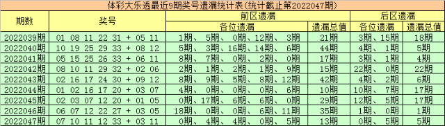 上期回顾:体彩大乐透第2022047期开出奖号为:07 10 11 12 33 + 03 11,其中前区各位奖号分别遗漏:0期、4期、4期、0期和5期,遗漏总值为13期,后区号码分别遗漏0期和5期,遗漏总值为5期。