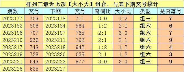 大小分析:排列三上期开出号码535,大小类型为【大小大】,最近七次开出大小类型大小大的奖号分别为:709、806、707、936、748、738、649,其下期分别开出号码:711、964、765、792、942、035、977。其中号码大小比为13:8,大号走势较热,预计本期大号不会转冷,看好大号再次热出,防全大组合出现。