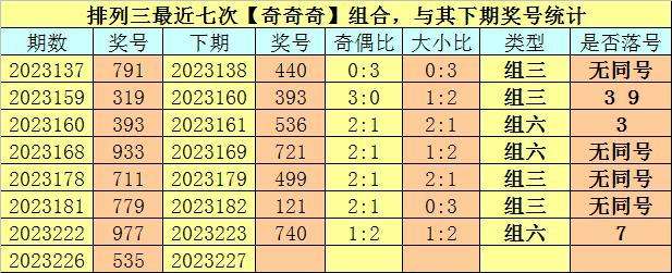 奇偶分析:排列三上期奖号为535,其奇偶类型为【奇奇奇】,最近七次出现奇偶类型奇奇奇的号码分别为:791、319、393、933、711、779、977,其下期奖号分别为:791、319、393、933、711、779、977。其中号码奇偶比为12:9,奇偶号码开出次数基本相当,本期看好奇数奖号大热,注意全奇开出的可能性。