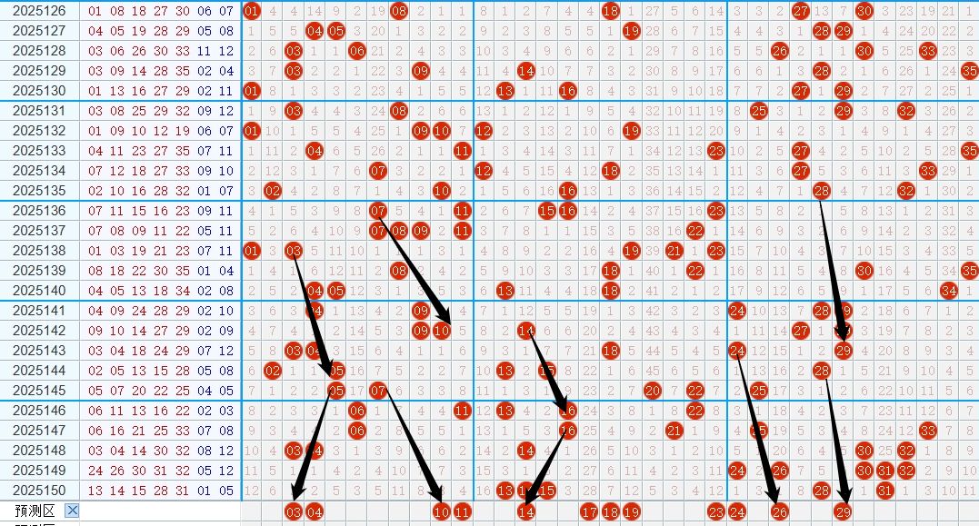 回顾上期25150期开奖13 14 15 28 31+ 01 05,其中一小区01-12出0个,二小区13-24出3个号,三小区25-35出2个!