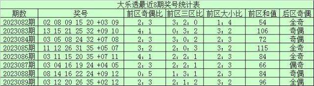 前区奇偶走势:上期前区奖号奇偶比为2:3,近8期前区奖号奇偶比为19:21,奇偶号码出现比例基本持平,,本期注意偶数号码热出,看好奇偶比2:3。