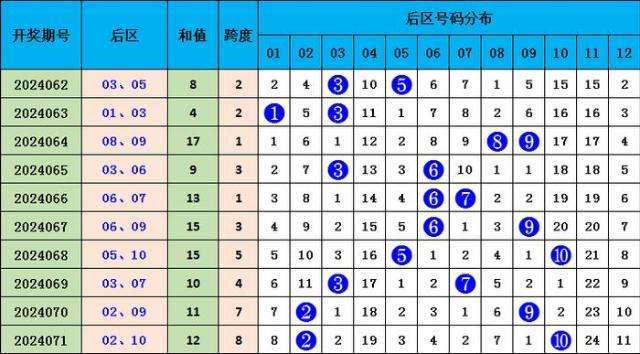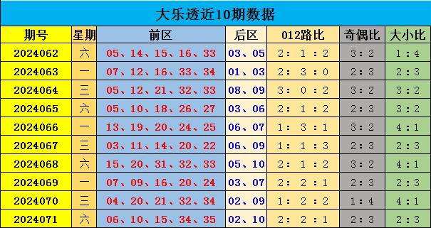 大乐透第2024071期开奖。当期开奖号码为:前区06 10 15 34 35,后区02 10。当期前区号码012路比2:2:1,奇偶比为2:3,大小比为2:3。